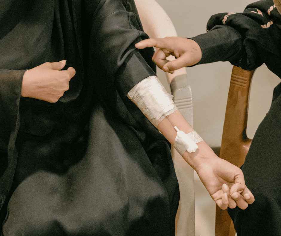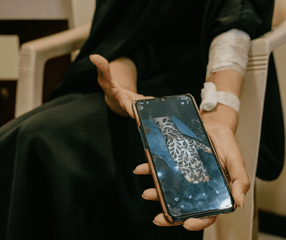 She scrolls through her phone gallery, bringing up photos of the bridal henna designs that she has created. As her hand moves over the screen, there is a contrast between those delicate designs and the pattern on her own hand from the PICC Line (Peripherally Inserted Central Catheter).