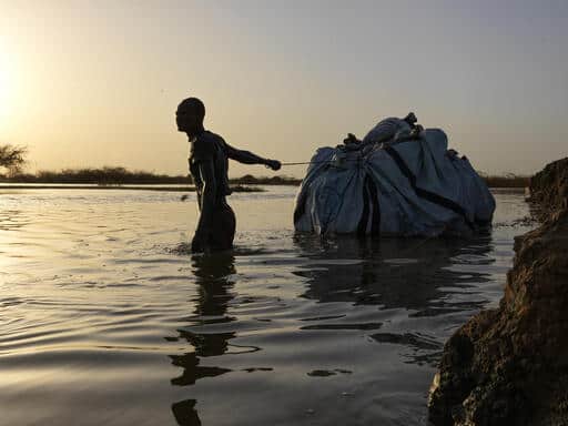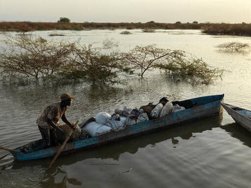 On this small raft is everything they own: some clothes, and a few pots to cook with, which are mostly filled with waterlilies they pluck from the water. Behind them, their village is almost fully submerged by the floodwaters. They had to leave quickly before the water got too high for the children and the elderly to wade through, and then travel by makeshift rafts or canoes dugout from tree trunks to get to safer land.