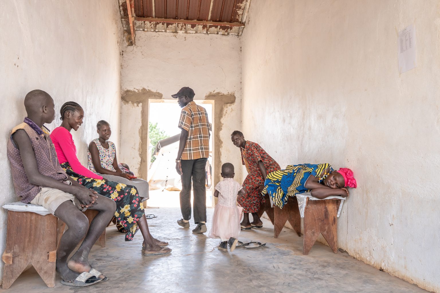 Under the shadow of a tree, a group is gathering, exchanging greetings. Peter, a mental health counsellor for Médecins Sans Frontières (MSF) and Margaret Abuk, MSF health promoter, are conducting an awareness and educational session for a group of overfifty people. A woman in the background is carrying a jerrycan of water on her head, walking slowly to go back to her shelter. In the distance, two children are standing hand in hand the older taking care of the younger. It is a normal day in Gomgoi camp, South Sudan, where 10,000 internally displace people have settled after fleeing the city of Agok, located a few dozen kilometres north, in February 2022, due to violence.