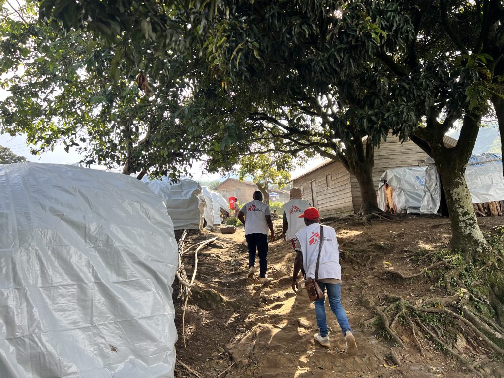 MSF staff walk through the site for displaced people in Bweremana, on the border between North Kivu and South Kivu provinces, in eastern DRC. ©Igor Barbero