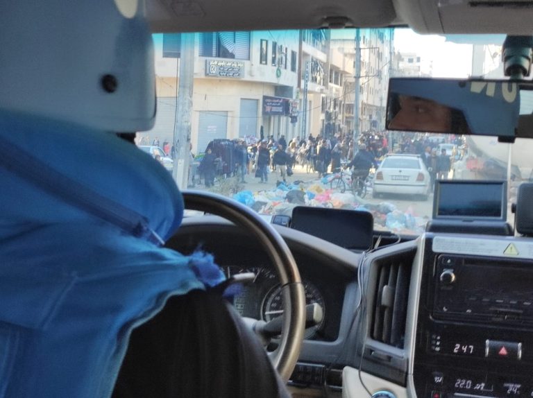 The main objective of this convoy was to deliver 19,000 litres of fuel to Al-Shifa. This fuel is essential, because it is used to run the generators that supply the hospital with electricity. We managed to pass the checkpoint which separates north and south Gaza at the beginning of the afternoon, and immediately afterwards, our two cars and the fuel truck were surrounded by a crowd of quite young people who demanded water and food. They were really disappointed that we were only transporting fuel. We had a lot of difficulty getting through this very dense crowd of hungry people.