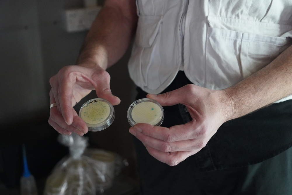 - Professor James Ebdon from the University of Brighton shows two Petri dishes, used to identify the presence of viruses in the fecal sludge. This method is five or six times faster than other detection methods, which helps in making timely decisions and appropriately adjusting the treatment process.