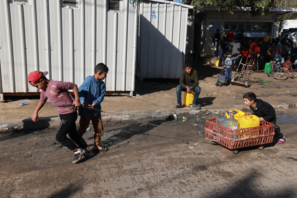 The long line is visible from afar, hundreds of people of all ages, most of them holding distinctive yellow or blue 40-litre jerrycans. Some live in tents close to the water truck that attracted the crowd to this spot in Rafah, a town in the south of the Gaza Strip. Others live in shelters up to several kilometres away, and brought wheelchairs, hand trucks, shopping carts and even strollers to carry the vital resource back to their shelters. One visually impaired man has come with his young daughter – the girl leading the way, her father carrying the water. They walked two kilometres to get here, for there is no clean water in Al-Mawasi, the coastal area where they are living.