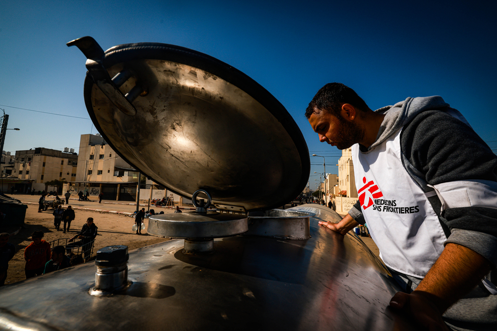 - Youssef Al-Khishawi, Man MSF water and sanitation agent, inspects the water level inside an MSF truck in the southern Gaza town of Rafah’s Saudi neighborhood.
