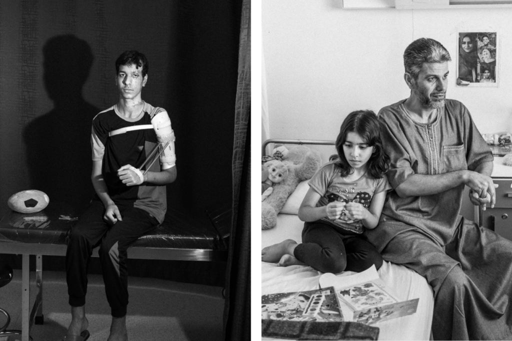 As the sun streaks through the small window of the sterile hospital room, warm orange lines fall on to the side of 17-year-old Karam’s face, highlighting ridges of white scars across his left cheek. As he gets up slowly into sitting position at the hospital run by Médecins Sans Frontières (MSF) in Amman, Jordan, he uses his right hand to strap a long piece of skin-coloured plastic onto his upper left arm.