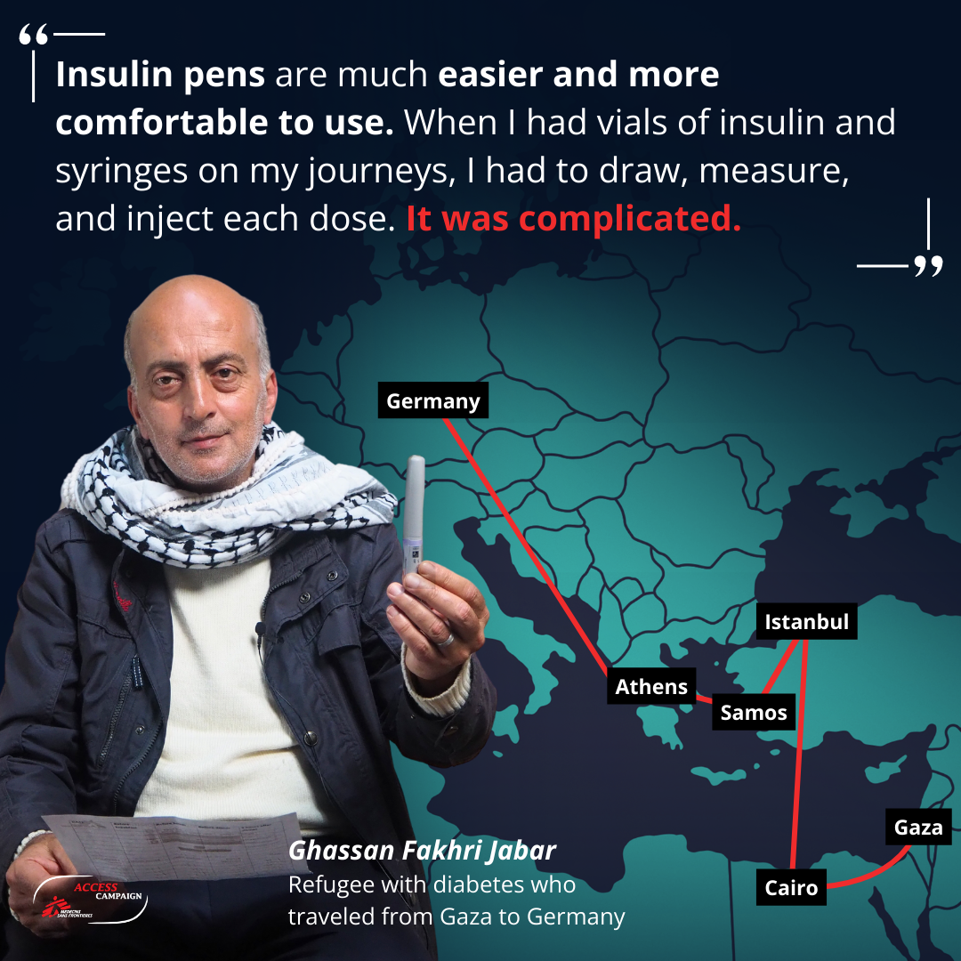 The insulin pens are much easier and more comfortable to use. When I had vials of insulin and syringes on my journeys, I had to draw, measure, and inject each dose. It was complicated. Obviously getting access to any insulin was the main thing, but it would have been so much easier for me with pens, which are convenient, and the injection is light and painless. I appeal to the whole world to support MSF in continuing to provide insulin through pens, not vials.