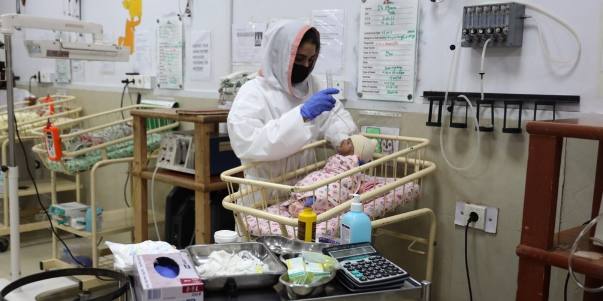 This facility is where Wazira Begum, a grandmother from the nearby village of Abdul Ghani Solangi, came to visit her newborn grandson, now being treated in the neonatal intensive care unit (NICU) for a chest infection. ‘We have lived in a tent since the 2022 floods destroyed our house. It gets very cold in winter, and we couldn’t protect the baby from the cold,’ she explains. ‘We brought him here in a very serious condition. Now, thanks to the doctors, he’s doing much better.’