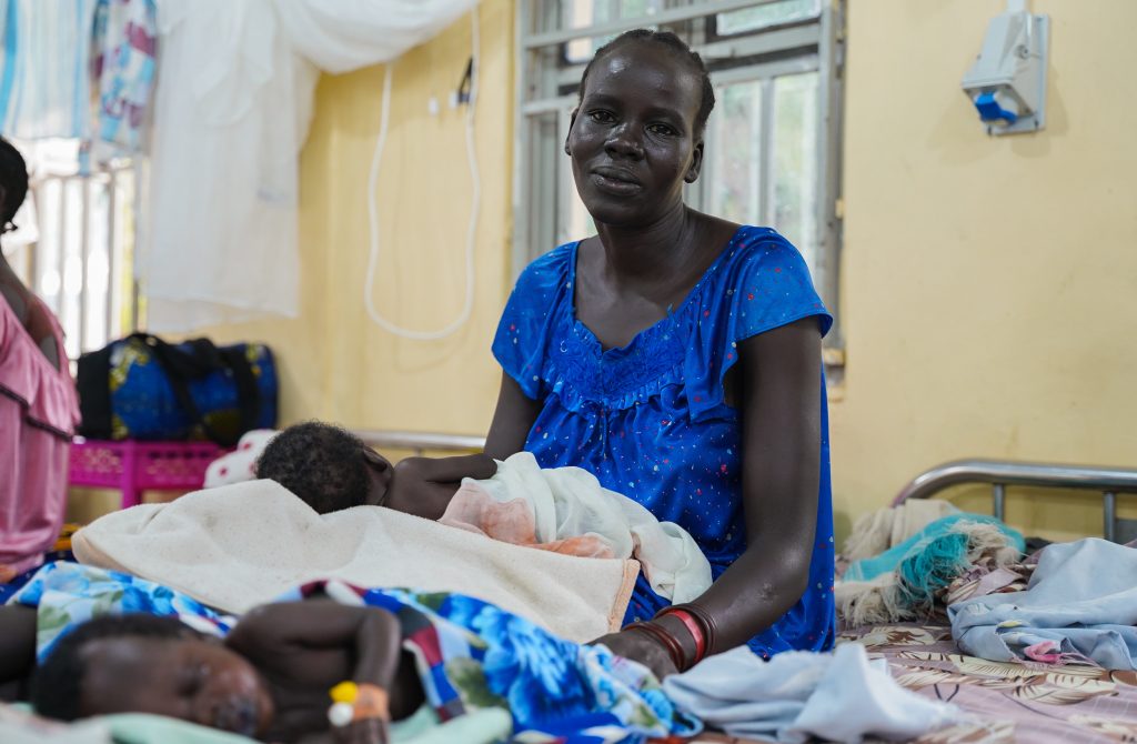 Nyamai Buay, 34, sits on her bed at the Bentiu state hospital, cradling her three-day-old twins, whom she delivered there. She recounts the struggles she faced while trying to deliver her nine children.