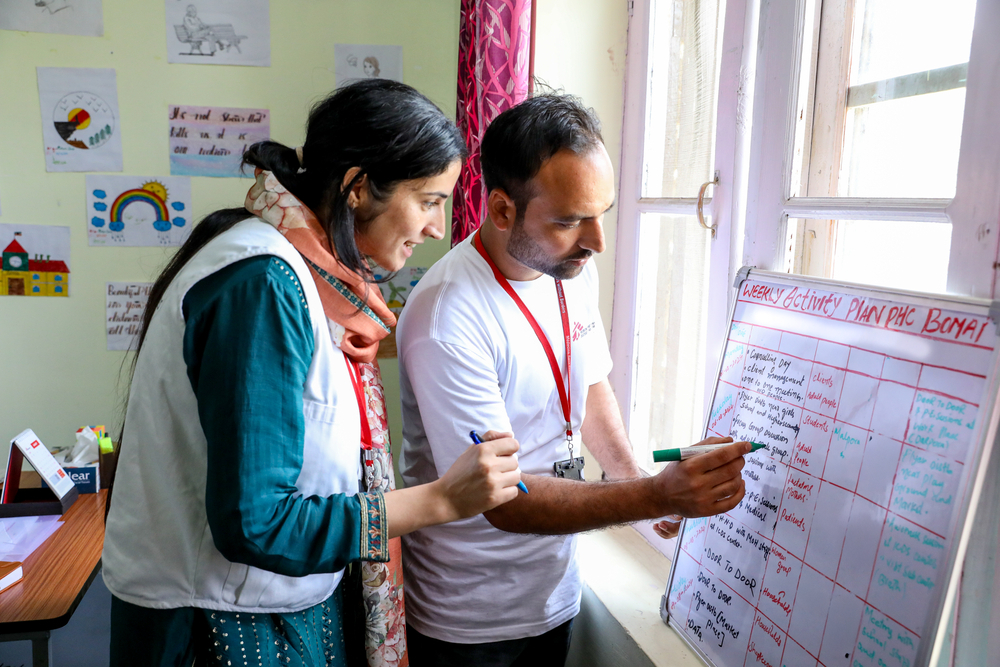 The day is quite similar for MSF Community mental health workers, the only difference is the terrain and their defined approach as per the community members. Zainab-U-Nisa and Mudasir Ahmad Lone, MSF community mental health workers, reviewing their daily schedule at Bomai Primary Health Center in Baramulla, Kashmir. Teams have to walk in a difficult terrain to reach community members and conduct outreach activity.