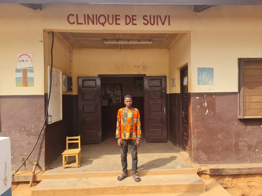 Adolphe Andao, 22, a type 1 diabetes patient, in front of the chronic disease follow-up clinic run by MSF at Carnot Hospital. ©️Amadou Barazé/MSF