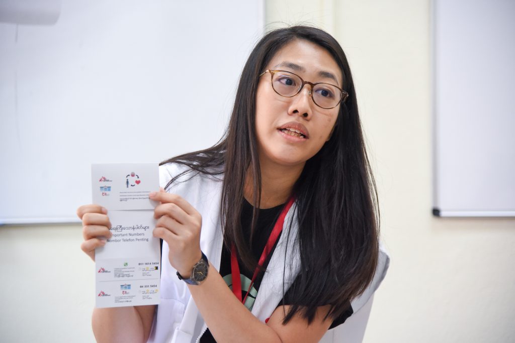 MSF Psychologist and Mental Health Supervisor Chew Ching Hoay explains that the Rohingya dialect does not have a direct translation of the term ‘mental health’. The closest translation of ‘heart-mind-body’ is illustrated on the contact card that patients are given for their safekeeping.