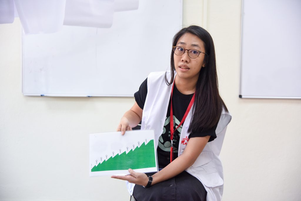 MSF Psychologist and Mental Health Supervisor Chew Ching Hoay explains a chart she uses to identify how patients are functioning. The chart allows patients to point out the severity of functions such as sleep quality and appetite. ©️Steven Ooi