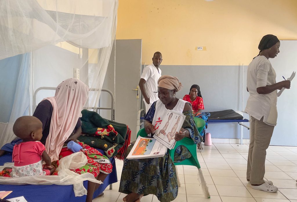 At the Am Timan hospital in eastern Chad, MSF launched an emergency intervention during this peak period in August 2025. In a hospital room, a health promoter shows Kadija Mahamad Zen an awareness-raising picture book. Kadija is holding her one-year-old daughter, Youssoura Adam, in her arms. “First, when my child fell ill at the beginning of the rainy season, […] I had to pressure my in-laws to take her to a health center. The health worker told me that her condition was beyond their capabilities, and we were referred to Am Timan Hospital.”